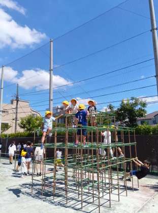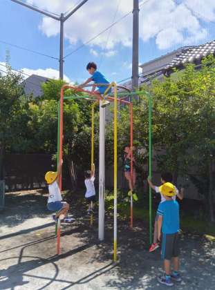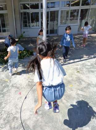 今日も元気に外遊びをしています。ポールを使って大繩をしているとちょうどミストが流れてきて気持ちがいいです。