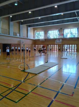 体育館では、高跳びの練習が始まっていました。夏にオリンピックを見ていて、華麗な背面跳びをしたくなるかもしれませんが、危険なので小学校ではきちんと着地できる「はさみ跳び」の練習をします。