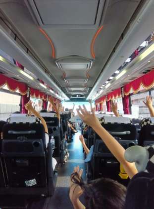 バスレクが始まりました。バスレク係が準備をがんばってきたことがよく分かります。まずは、クイズ大会です。