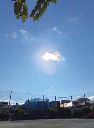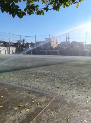 児童の登校前にスプリンクラーで水をまき、登校後に再度まきますが、太陽が出続けていると焼け石に水、それでも一度表面の熱が取れるので、日がかげって使える時のために準備をします。今日も日差しなどの状況により、屋外の活動の可否を判断していきます。