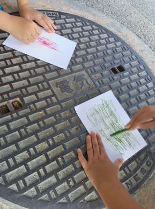 水道のタイル、マンホール、地面、木、葉っぱ・・・様々なものに紙を置いてこすっています。