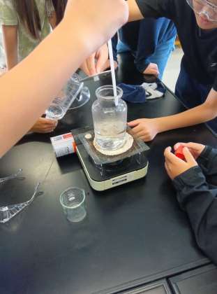 この日は、炭酸水に含まれる気体を調べていました。これは「水中置換」でしょうか。何だか懐かしい表現です。水で満たした容器に、炭酸水から出る気体を入れ、水と置き換えていきます。