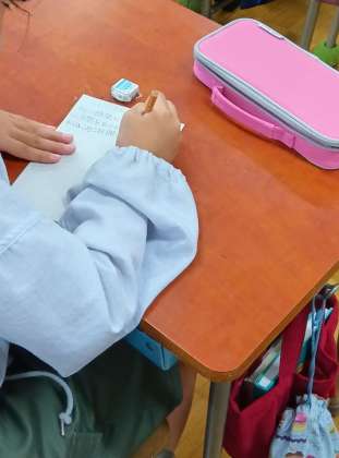 楽しかった学びの思い出を振り返り、ふじやまビレジでお世話になった方々へのお礼の手紙を書いていました。おいしいごはん、快適な部屋、うまくいった飯盒炊爨、カレー作り・・・見ていると、表に見える部分だけではなく、知らず知らず快適に過ごすことができたことを支えていただいたことなどにも目を向けて書いているようでした。