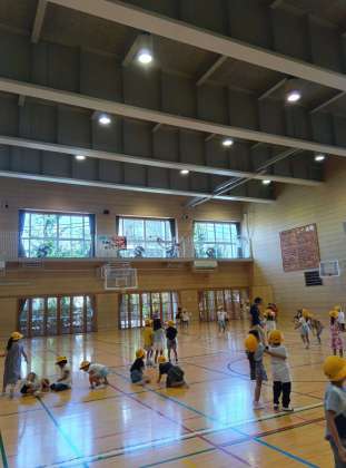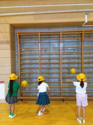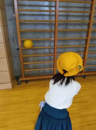 さて、体育館遊びは1年生。肋木(ろくぼく)にボールを投げていた子たち、すぽっとボールがはまったのを見て再度挑戦しましたが、なかなか同じようには入りませんでした・・・が、終了直前にもう一度きれいにはまって喜んでいました。