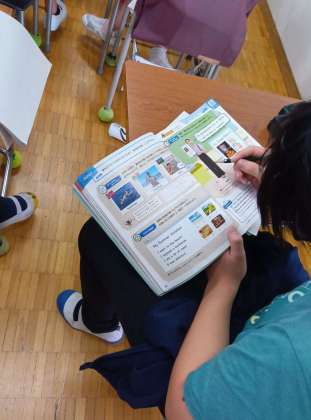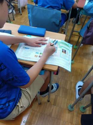 夏休みのできごとを伝える絵日記を使ったスピーチを聞き取っています。良く聞き取って、問題に答えていました。