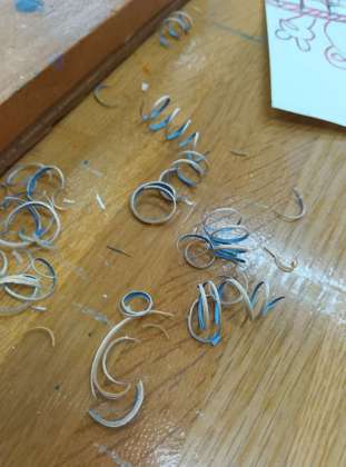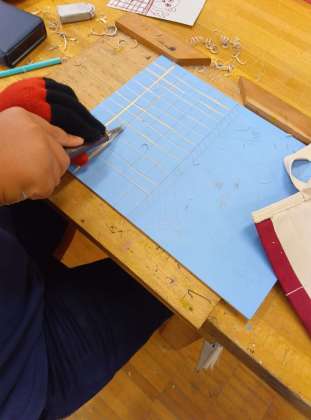 でも、板を押さえるために、ついつい彫刻刀を持っていない手を彫刻刀の先に置いてしまうことがあります。ここだけは都度注意をしていく必要があります。でも軍手さえしていればそこまで深く手を切ることはないと思います。