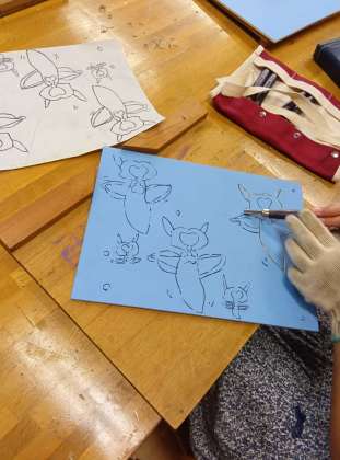 4年生は図工で版画に取り組んでいます。小学校に入って初めての木版画です。彫刻刀を使います。