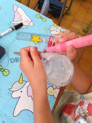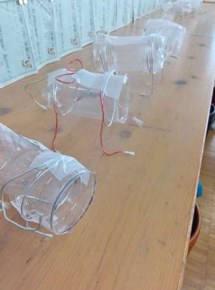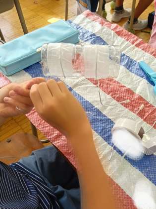 生き物のようです。この日は、ペットボトルのボディに針金のほっそりした足で、ベースになる部分を作っていました。