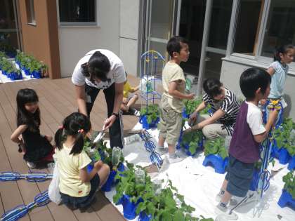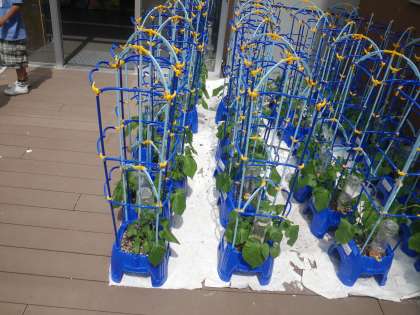 早速つるがのびるのを支える支柱を付けました。いつ頃花がさくのでしょうか。葉の数が何枚くらいになったら咲くのでしょうか。楽しみです。(校長 箭内)