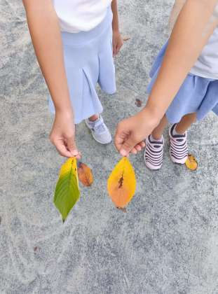色づいた葉をもって、2人の児童が秋を届けに来てくれました。ありがとう・・・秋は確実に・・・もうすぐそこまで・・・暑いけどもっ!