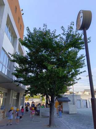 確かに気温が上がってきましたが、体感的にはそこまで危険な暑さにはなっていません。よかったです。日かげに入ると涼しく感じます。下校前にスプリンクラーで水をまき少しでも涼しくと準備しました。それで濡れたさくら通りの部分は打ち水効果でさらに涼しいです。