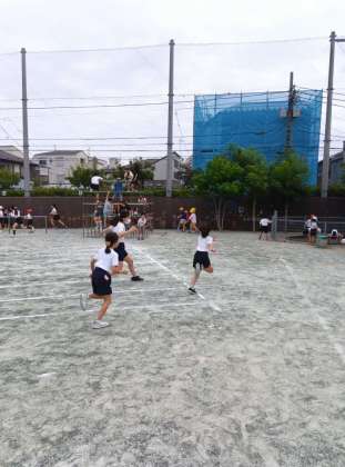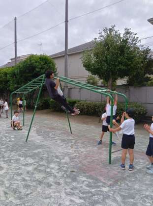 涼しい秋の中休み、子どもたちが思いっきり走り回っています。涼しくなくても走り回っていますが・・・。涼しいですが、思いっきり走ると汗がさすがに出ます。暑いです。でも気持ちがいい。雲梯で子どもたちと遊んでいる先生は懸垂をしています。すごい!