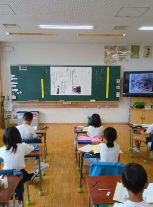 さすが2年生、何度か経験してもう慣れています。ワークシートを半分に折って前の時間のワークシートの半分の裏に貼り付けていきますが、その時に、