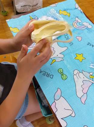 白い紙粘土に絵具を少しだけ置き、内側へ内側へと包み込むように入れてこねていきます。のばしたり、つぶしたり、丸めたりしていくと色が全体に均一に広がっていきます。いきなりたくさん絵の具を入れるとなかなか混ざらず、偏りもできるので、量を少なめにするのがポイントです。みんなきれいなパステル系の色になっていました。作業を見ているとうどんをこねているようでした。