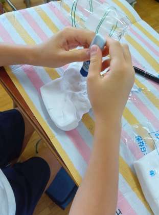 何度かお伝えしている3年生の図画工作「ガポガポさん」の紙粘土の色を付けている場面に出会うことができました。