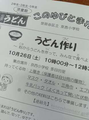 そうです。ゆびとま人気企画「うどん作り」(10月26日・土曜日)のお知らせでした。人気企画のため、今回は2・3・5年生を対象に行います。ふるってご参加ください!1・4・6年生は、次回をお楽しみに!