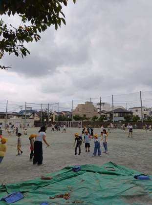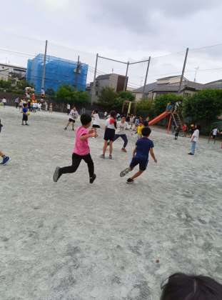 今日は朝からずっと曇っていて涼しいです。昼休み、子どもたちが元気に校庭で遊んでいます。