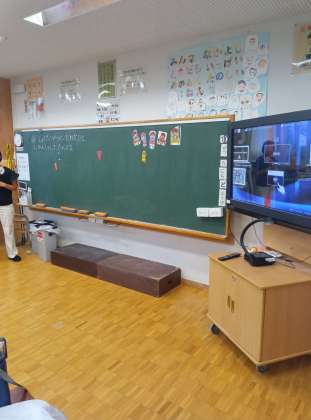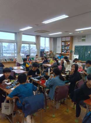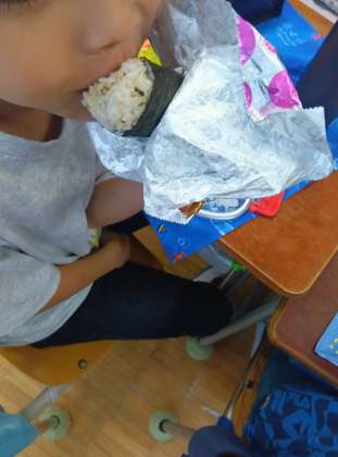各学級の様子をざっと見て回らせてもらいましたが、どこでも楽しそうにお弁当について話をしながら、大きな口でおにぎりやおかずをほおばっていました。