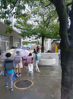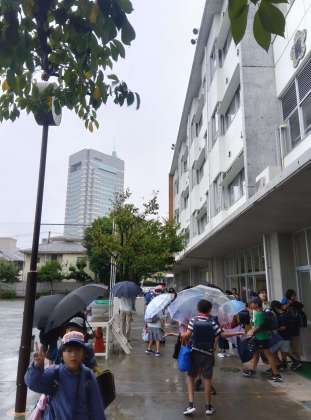 午前中はずっと雨がぽつぽつと降っていて、下校時もまだ降っていたので、子どもたちは傘を差して帰っていきました。この後も夕方までは雨が続きそうです。