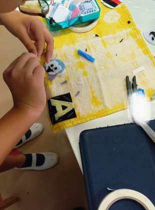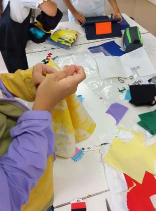 家庭科の時間、5年生が1学期の染め物の作品に装飾を施していました。手縫いで布やフェルトを縫い付けています。5年生から始まった家庭科の裁縫の学習ですが、半年を経て、手つきも慣れたもので、針を受け取って引っ張るときの手つき、なかなか様になっています。