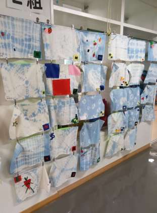 染め物の模様も全員違いますが、そこに少しの飾りが入るだけで更にオリジナリティが増し、世界に1つだけの作品になります。せっかく染め物の柄がきれいなので、飾りは控えめに。端に付けたちょこっとした飾りがすてきでした。