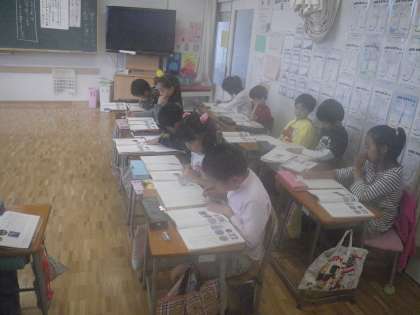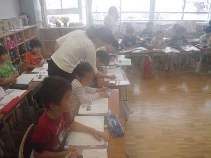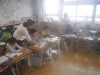 今日は国語で「米と麦」という説明文の授業です。子どもたちは米と麦を比較しながら読み取り、ノートに書いています。森口先生が一人一人のノートを確認し助言をしています。4年生の藤原先生も同じように勉強を重ねているのです。(校長 箭内)