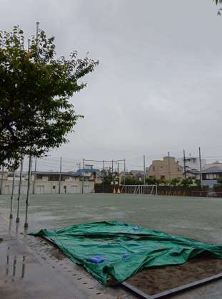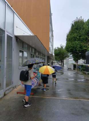 朝から雨。今日は一日中雨になりそうです。細かい雨で風もあり傘を差していても濡れてしまいます。子どもたちも傘を傾け、それでも濡れて大変そうに登校してきました。