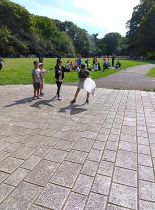 さて、それも終わると3・4年生がゴミ袋をもって歩き始めました.全体を仕切る5・6年生に対し、自分たちにできることを考えた結果、ごみを拾ってきれいにするということになったそうです。