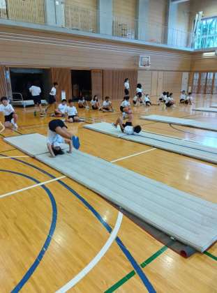 さて、マット運動では「後転」の練習しているところでした。前転ができる子が結構います。後転は、ただ前転の逆と思われがちですが、意外に難しいです。首をしっかり折って内側に入れられないと首を傾げたような恰好になり、うまく真っすぐ回れません。簡単なようで意外に難しいのです。