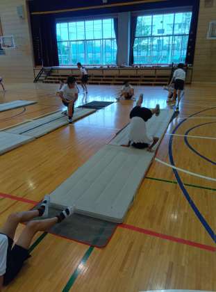 体育館では、マット運動をしていました。写真がありませんが、肋木(ろくぼく)もしていました。肋木って普段は壁に埋め込まれてようになっていますが、実は外に出せるんです。今度出会えたらお見せします。