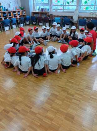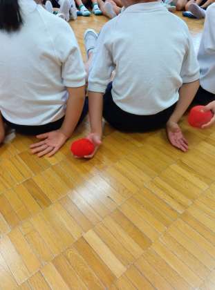ハンカチ落とし?と思ったら、玉入れの赤玉を回しています。それも数がどんどん増えていきました。後ろは見ません。手の感覚で隣から玉が回ってきたことを感じてそのままキャッチ、そして次の人へ回す、という動作を行っています。