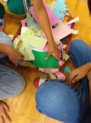 実は、こういう時に役立つのが、画用紙の「切れ端コレクション」。ちょっとした部品を作るのに新しい画用紙を使うと何となくもったいない感じがしてしまいますが、この切れ端コレクションからならちょうどよい大きさの紙を見付けてくることができます。学級や学年で集めているものがあると思います。色もたくさんあって選び放題です。