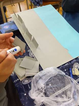 3年生の図工で何度もお伝えしているガポガポさん。ガポガポさんが飾られるステージ?舞台?づくりが進んでいました。