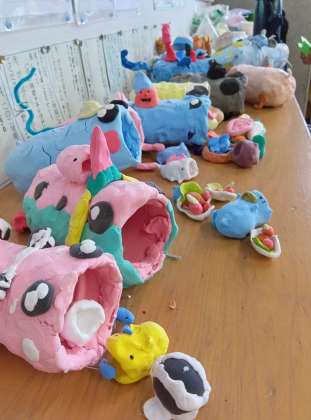 これもまたなかなか凝っています。きっとガポガポさんを作る時点でそれぞれにストーリーがあるのでしょう。それを表現しようとしているのがよく分かります。細かい部品を準備して作っていっていました。広がるガポガポさんワールド♪ガポガポさんも微笑ましい表情で見守ってくれています。
