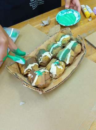 5年生の図工「ダンボールでつくっちゃお」の仕上げと鑑賞をしていました。
