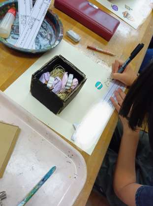 時間が決められ、最後の仕上げをします。作品カードも書いて思いを伝えます。下に敷くマットもお洒落なものを作っている子もいました。これも作品の一部ですね。