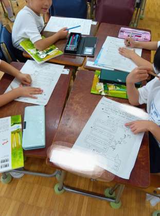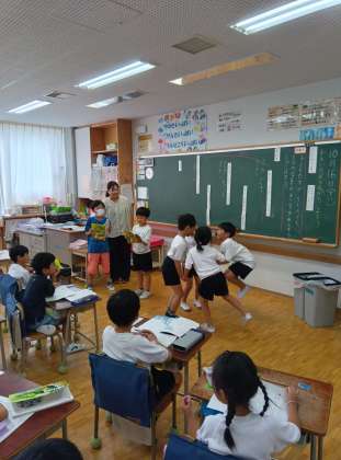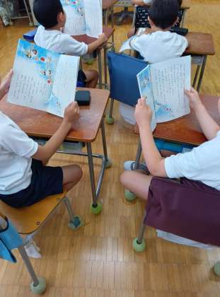 この日の授業では、この会話文の読み方について考えていました。初め子どもたちは「同じ読み方」と言っていましたが、ここに考えたことをグループで話し合い、動作化することで、「もっともっと」という気持ちで段々大きな声になっている、と気が付きました。くじらぐもの声もです。