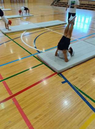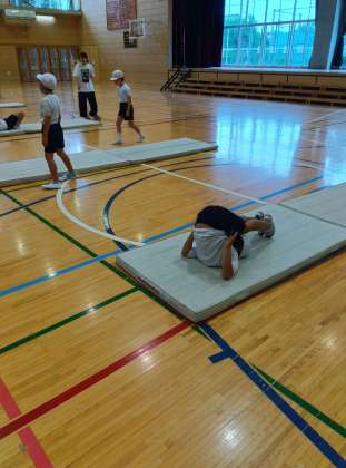 前転を中心に練習していましたが、ふと見た時に見事な腰倒立を決めている子がいました。よく組体操にも入る技で、足を上げ、腰に当てた手の「肘」で背中をぐっと支えて真っすぐ伸ばす技です。正確には「背支持倒立」と言います。この後、背中をぐにゃりと曲げて大きく体を折っていました。体の柔軟性がすばらしい。
