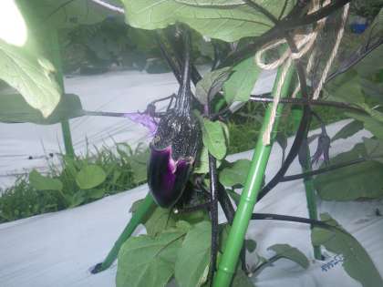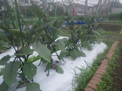 第二校庭の花壇には野菜が実り始めています。二年生が育てているナスです。毎年六月から九月ころまでナスは実を結び続けます。講師の先生に指導していただいたので特にぐんぐんと成長しています。(校長 箭内)
