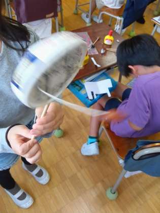 チーズが入っていたような丸い箱と割りばし、ヒモに付けたどんぐりを使って、「でんでんだいこ」を作っている子がいました。これがまたちょうどいい感じに弾むような心地よい音を出します。いいアイデアだなあと思いました。