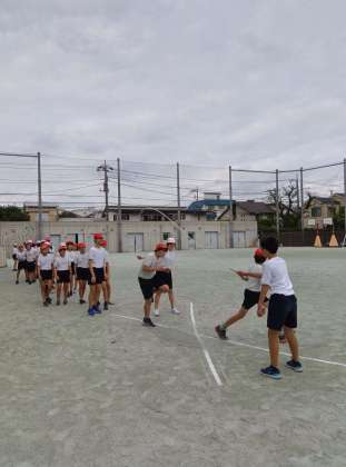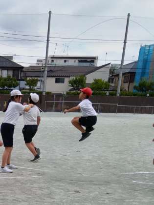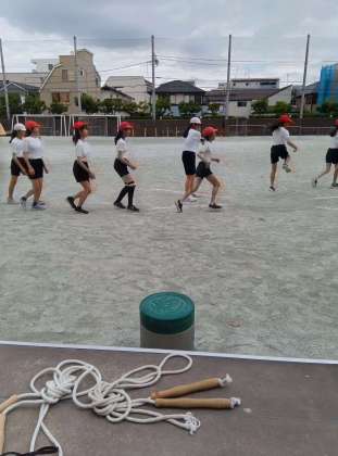でした。声をそろえて数えています。前の人に近づいてどんどん入っていきます。前で跳ぶのを意識するように地面には大きな×がかかれています。ポイントをしっかり意識して取り組んでいます。気持ちを一つに・・・