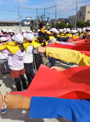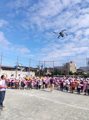 ドローンが飛び立ち、歓声が上がりました!遥か上空へと上がっていきます。撮影準備も完了です。