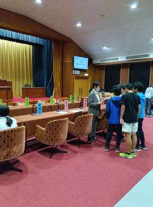 もう1校が一緒に参加しているので役割を分けてあります。京西小学校は、「委員長」役、「大臣」役、その他「委員」役を務めます。手前の座席に座る児童は、本会議に参加する国会議員役です。最後の賛成・反対を決めるのは国会議員役の児童の投票で決まります。