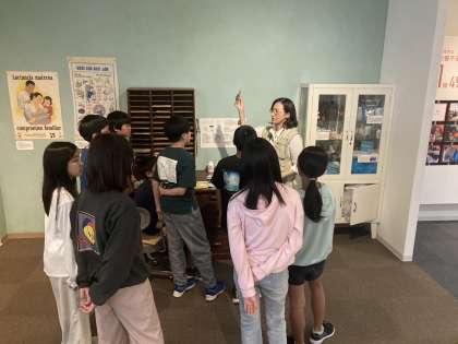 グループに分かれて見学をしています。グループごとにボランティアガイドの方が付いて展示の説明をしてくださいます。