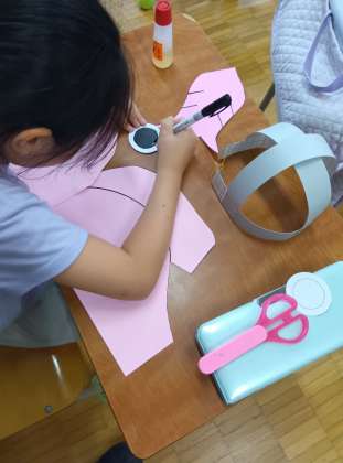 今回2年生は海賊が出てくる劇なので、海賊関係の小道具もたくさん必要そうですが、この日は、ぎょろっとしてかわいらしい目の生き物に扮するための被り物でしょうか、色もピンク色でかわいいです。