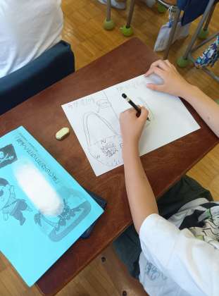 2年生が学芸会に向けて、頭にかぶるものや手に持つ道具など作っていました。