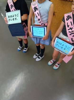 今週の「あいさつし隊」は2年2組です。「おはようございます。」などの文字を見せながら、元気に挨拶をしています。人は目から情報を得るのが得意なので、元気な声の挨拶とセットで効果的かもしれません。