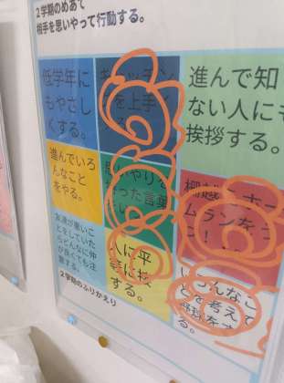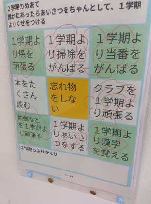 先日、4年生の教室に行ったときに、後ろのクリアケースに入った各自の目標に丸がついているのに気が付きました。4年生では、チャート表に9つの目標を入力していました。MLBで大活躍中の大谷選手が取り組んだことでも有名になったマンダラチャートを参考にしたものでしょうか。その中のいくつかに丸がついています。達成できた目標に丸をしてあるわけです。