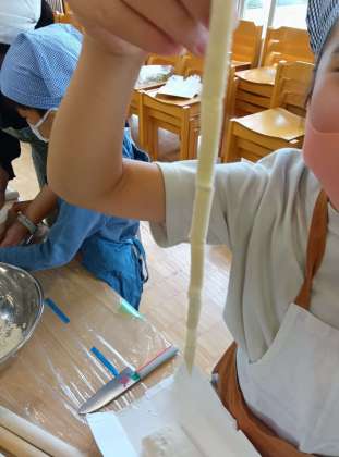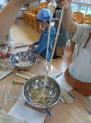 お仕事を終えた子どもたちは、しばし茹で上がりを待ちながら体育館で遊びです。うどんどんどんできる。