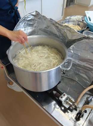 できた麺から家庭科室で茹で始めます。何といっても大量のうどんです。うどんどんどんゆでる。